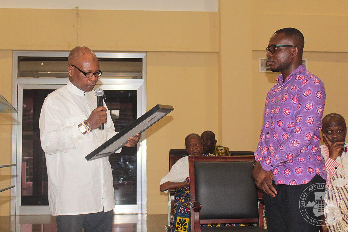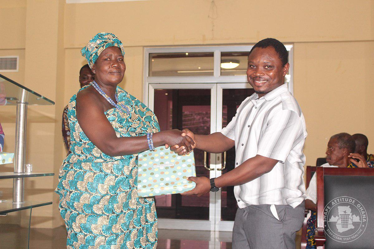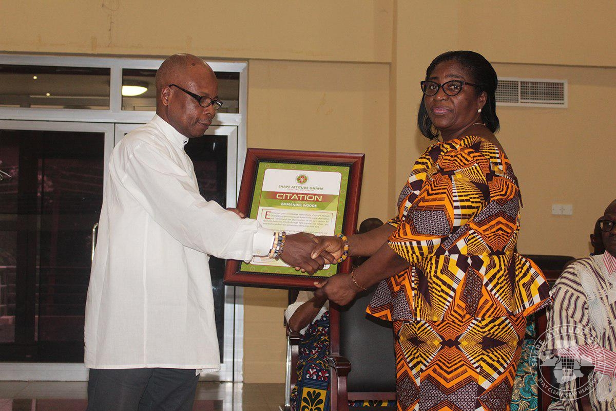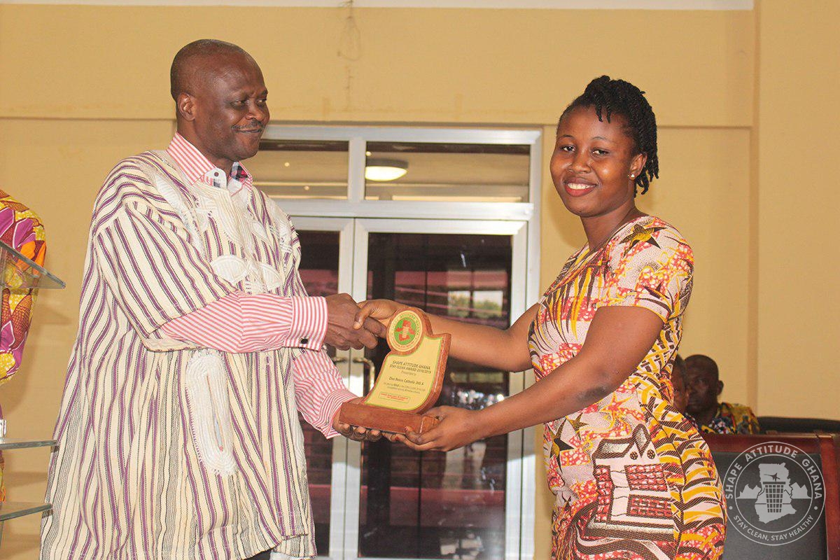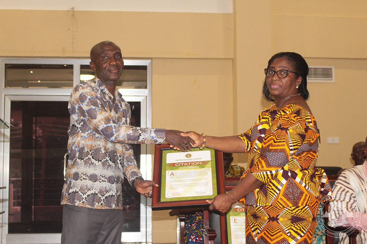 Mrs Victoria Ghartey receiving a citation for Mr Emmanuel Woode during the 2018/2019 Stay Clean Awards and 5th Anniversary