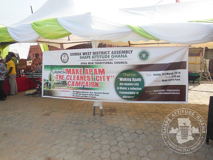 The Goma West District Assembly in the Central Region of Ghana in collaboration SHAPE Attitude Ghana and the Chiefs of Apam launched a campaign at Apam on 3 March 2019 under the theme “Making Apam the cleanest city in Ghana: a collective responsibility of the citizenry.”