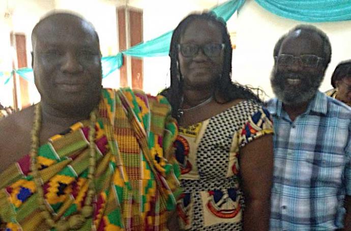 From Left, Omanhen of Effutu Traditional Area, Neenyi Ghartey VII, Director of Education Service of Effutu Municipality, Mrs Hilda Eghan and Director of Shape Attitude Ghana, Mr Wonderful Baisie Ghartey