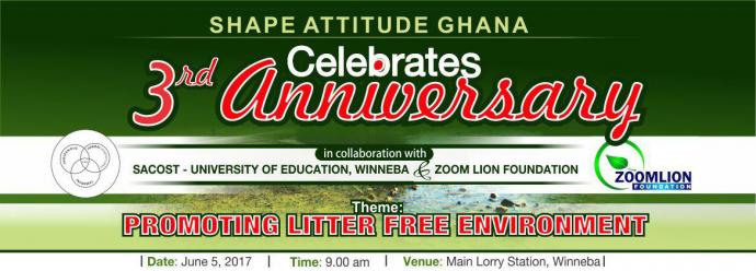 Shape Attitude Ghana would mark its third anniversary on June 5, 2017. The celebration is being organised in collaboration with The Centre for School and Community Science and Technology Studies (SACOST - UEW) and Zoom Lion Foundation. The theme for the year's celebration is dubbed Promoting Litter Free Environment. Three years down the line, the organisation is still in the business of sensitising local communities to avoid indiscriminate littering in order to have a clean environment.