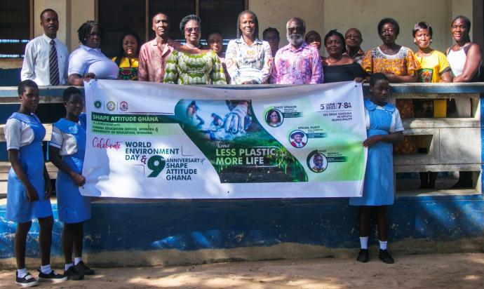 Shape Attitude Ghana has collaborated with the Ghana Education Service and the University of Education, Winneba to mark World Environment Day and to celebrate its 9th Anniversary. The event which was under the theme "Less Plastic More Life," took place on June 5, 2023, at the assembly grounds of University Practice Cluster of Schools, South Campus, UEW. The aim of the celebration was to sensitize the pupils to understand and appreciate the need to desist from littering their environments with plastic waste and to inculcate the habit of developing positive behaviour and attitude towards the environment.