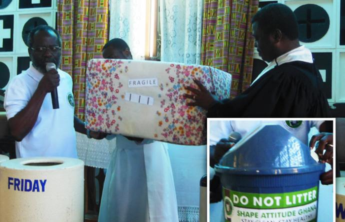 On September 13, 2015, Shape Attitude Ghana presented a trash bin to the Ebenezer Methodist Church in Winneba. The director of Shape attitude Ghana, Mr. Wonderful Basie Ghartey who presented the item indicated that the donation was to remind individuals present at the congregation on the need for environmental cleanliness. He cited that, usually when persons found creating waste or littering are approached, their first excuse is “they would clean up later”. Most often as he has observed, they leave the premises without tiding up. On this note, he advised that the best option in the attempt to achieving a clean environment is for us to refrain from dumping waste anyhow and anywhere in the first place.